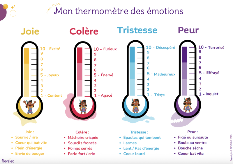 En classe et en dehors de la classe, vos élèves ressentent ces émotions. Pour les aider à les identifier et évaluer leur intensité, nous avons un document pour vous : le thermomètre des émotions (voir image ci-dessous).