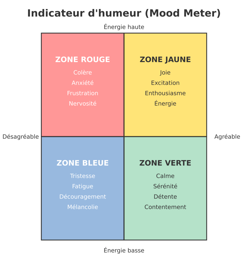 - Zone bleue (énergie basse + désagréable) : tristesse, fatigue, découragement.